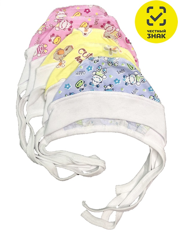 Ясельный чепчик из набивного полотна. На широкой контрастной резинке, с завязками. Швы выполнены наружу.