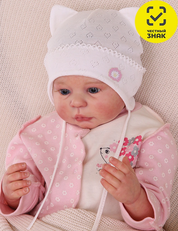 Шапка детская ажурная на завязках, декор – ушки и нашивка.