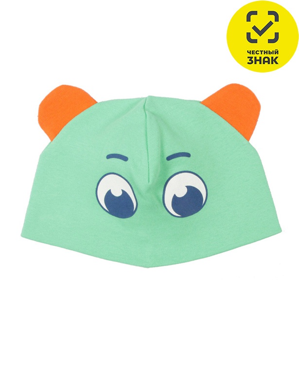 Шапочка двухслойная из рибаны с эластаном. Декорирована ушками из основного полотна дополнительного цвета и принтом.