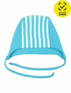 Шапочка для новорожденных, двухслойная, с завязками, из мягкого интерлока. Комбинирована из двух видов интерлока, гладкокрашенного и в мелкую вязанную из крашеной пряжи полоску.