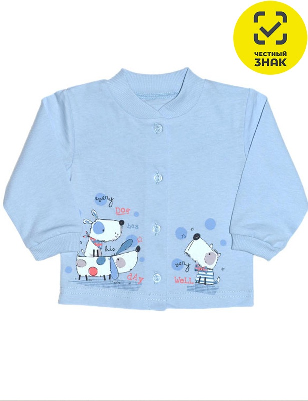 Кофточка для мальчика, застежка центральная по переду на пуговицы. Рукав длинный. Горловина, низ рукава обработаны ластиком. Низ изделия подшит. Перед с печатью.