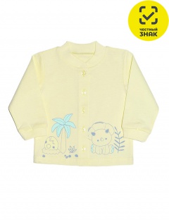 Кофточка для детей, застежка центральная по переду на кнопки (пуговицы). Рукав длинный. Горловина, низ рукава обработаны ластиком. Низ изделия подшит. Перед с печатью.