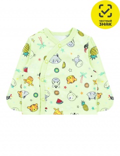 Распашонка из набивного полотна, с застежкой на плече, швы наружу. Горловина обработана рибаной хб. Закрытый рукав. Срезы окантованы.