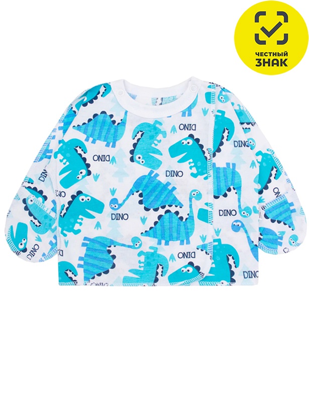 Распашонка из набивного полотна, с застежкой на плече, швы наружу. Горловина обработана рибаной хб. Закрытый рукав. Срезы окантованы.
