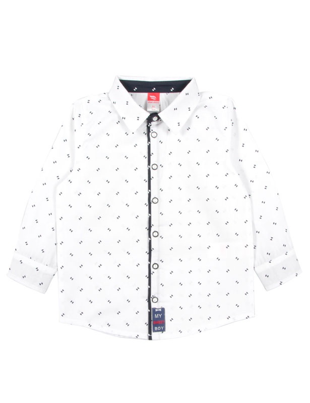 Рубашка из набивного полотна, полуприталенного силуэта, с длинным рукавом рубашечного покроя, с притачными манжетами, с застегивающейся шлицей рукава из хлопка. Воротник обтачной с притачной стойкой. Спереди декоративная нашивка. Нашивка, стойка, декоративный кант по планке, манжет внутри и пуговицы контрастных цветов.