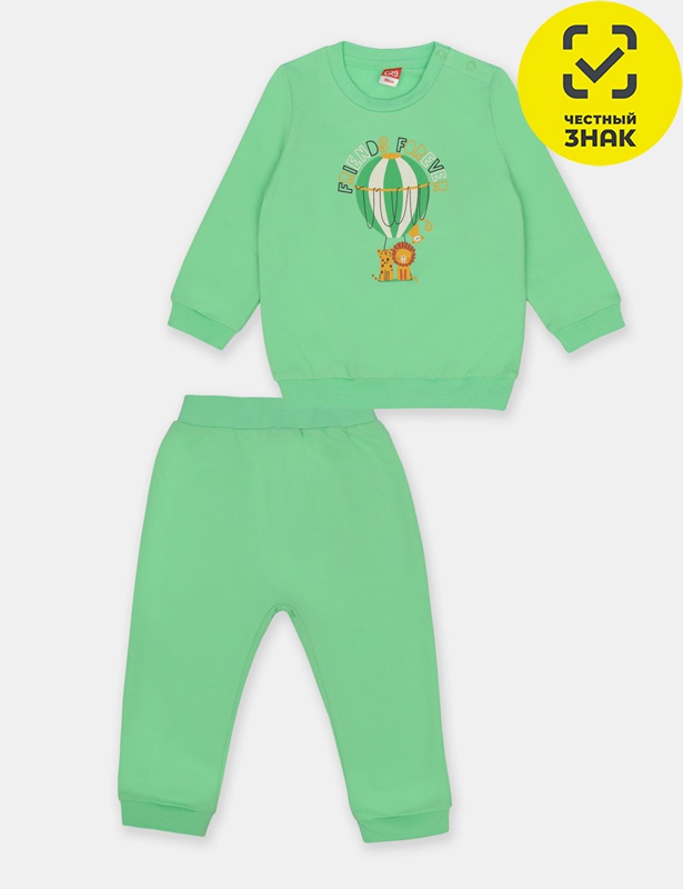 Комплект для мальчика (джемпер, брюки) из мягкого футера с начесом. Джемпер с длинным рукавом, горловина круглая, оформлена кашкорсе. На плече застежка на кнопки. На полочке выполнена шелкография в виде животных на воздушном шаре и надпись - друзья навсегда. Брюки без среднего шва. Пояс и манжеты из рибаны.