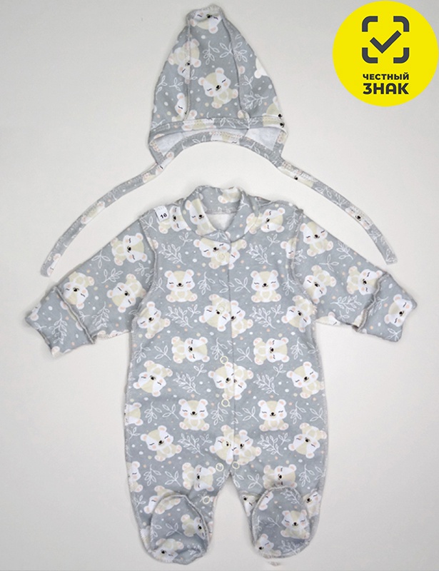 Комплект из трикотажного полотна интерлок. Комбинезон манжета с отворотом, с застежкой на кнопке по центру и по шаговому шву и чепчик. Комбинезон и чепчик в размере 16 и 18 сшиты швами наружу. Комплекты упакованы по 1 штуке.