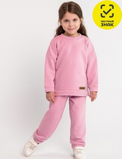 Костюм из футера трехнитки без начеса состоит из 2-х предметов. Джемпер с длинными рукавами со спущенной линией плеча, на манжетах, округлый вырез горловины, притачной пояс по низу изделия. Брюки на поясе на резинке, по низу на манжетах.