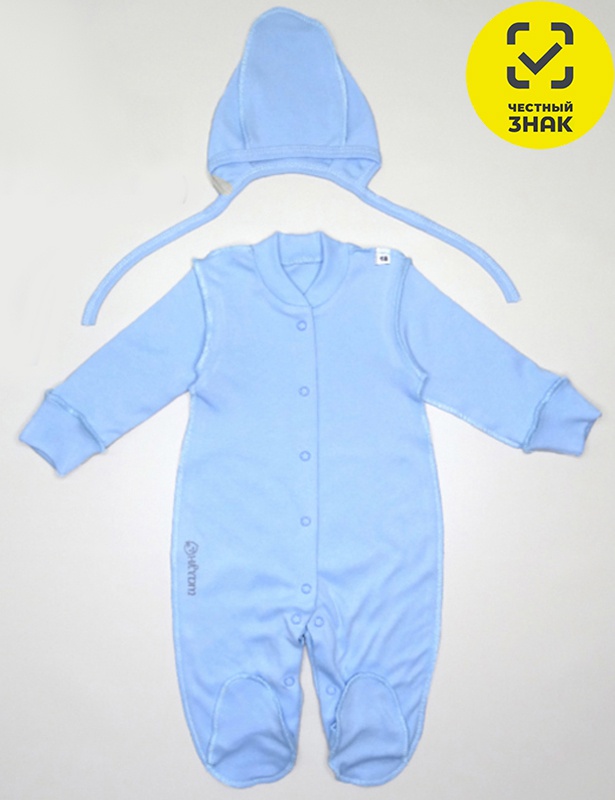 Комплект из трикотажного полотна интерлок. Комбинезон манжета с отворотом, с застежкой на кнопке по центру и по шаговому шву и чепчик. Комбинезон и чепчик в размере 16 и 18 сшиты швами наружу. Комплекты упакованы по 1 штуке.