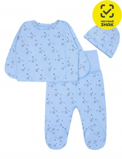 Комплект ясельный из интерлока состоит из 3-х предметов. Распашонка с длинным закрытым рукавом с царапками, ползунки с закрытой ножкой на эластичном поясе, шапочка.