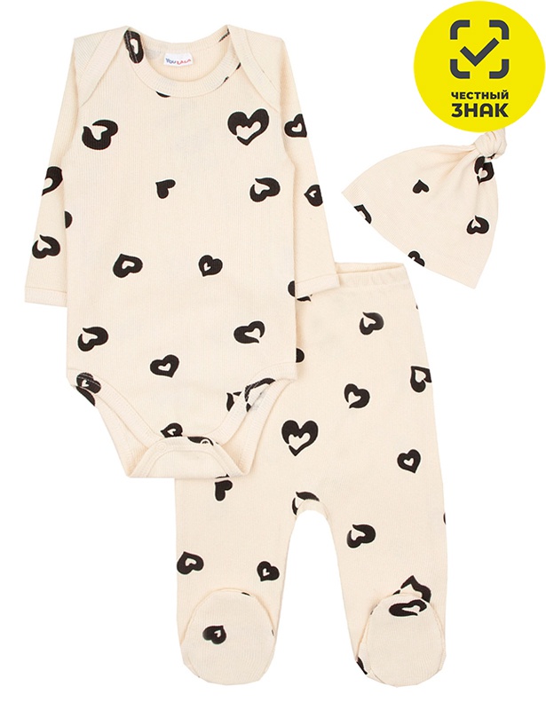 Комплект из рибаны включает три предмета: боди с длинными рукавами, брюки и шапочку. Боди застёгивается по низу на кнопки, а брюки имеют закрытый низ. Шапочка также входит в комплект.