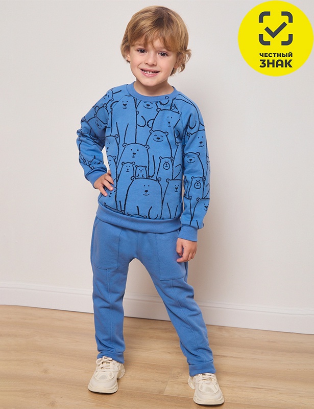 Костюм ясельный из футера двухнитки с микро-начесом состоит из 2-х предметов. Джемпер с длинными рукавами-реглан на манжетах, округлый вырез горловины с застежкой на кнопки по линии реглана, печать на полочке. Брюки на поясе на резинке, внизу на манжетах, накладные карманы.