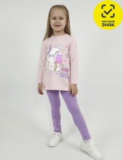 Комплект для девочки. Футболка свободная, с печатью по переду и двумя карманами в боковых швах. Рукав втачной, длинный. Низ изделия подшит с резинкой по боковым швам. Горловина обработана ластиком. Лосины длинные с печатью на правой передней половинке внизу. Вверху на резинке.