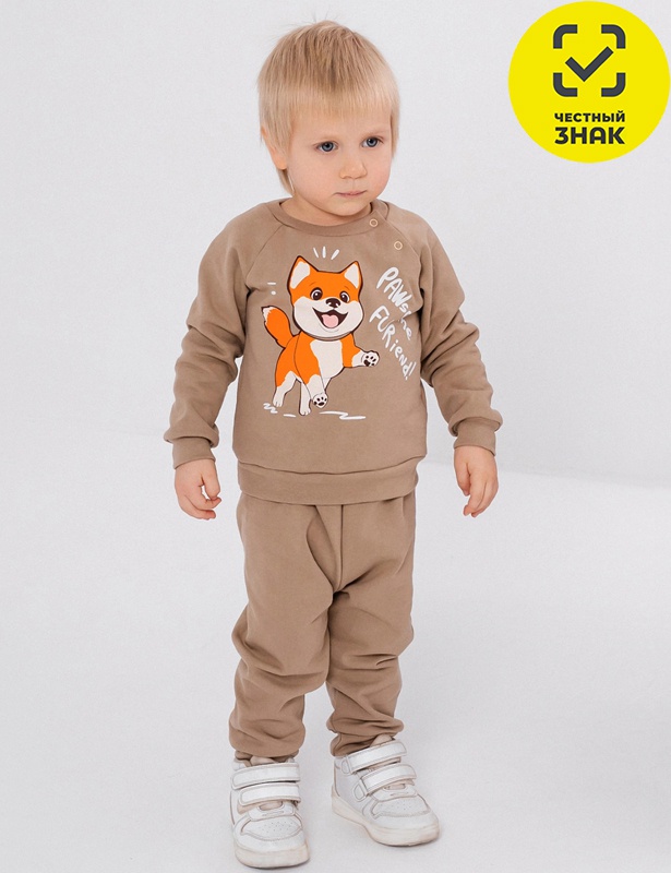 Костюм ясельный из футера двухнитки с микро-начесом состоит из 2-х предметов. Джемпер с длинными рукавами-реглан на манжетах, округлый вырез горловины с застежкой на кнопки по линии реглана, печать на полочке. Брюки на поясе на резинке, внизу на манжетах, печать на левой половинке.