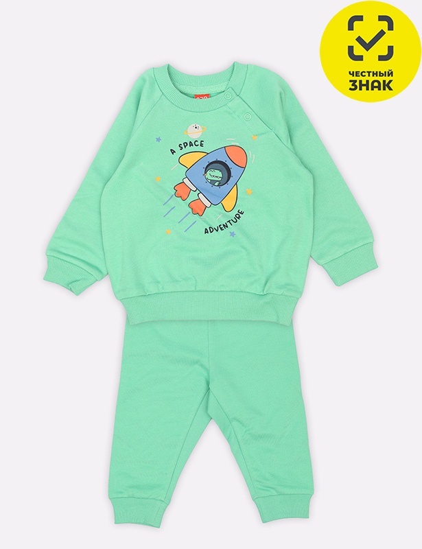 Комплект одежды для мальчика состоит из толстовки и брюк. Толстовка свободного кроя сшита из мягкого трикотажа, круглый ворот отделан кашкорсе. Рукав реглан, по переднему шву рукава расположена застёжка на кнопки. На передней части толстовки размещена шёлкография с изображением динозавров. Брюки изготовлены из мягкого трикотажа, пояс и низ оформлены кашкорсе.