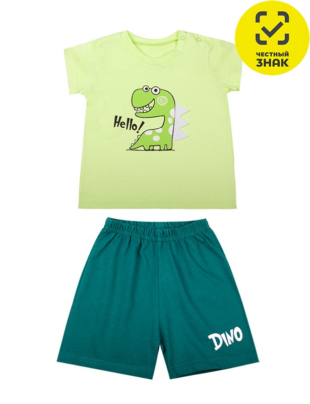 Комплект для мальчика состоит из 2-х предметов. Футболка из гладкокрашеного полотна с короткими рукавами, округлой горловиной, на полочке печать и аппликация из фетра. Шорты с эластичной лентой в поясе и с печатью.