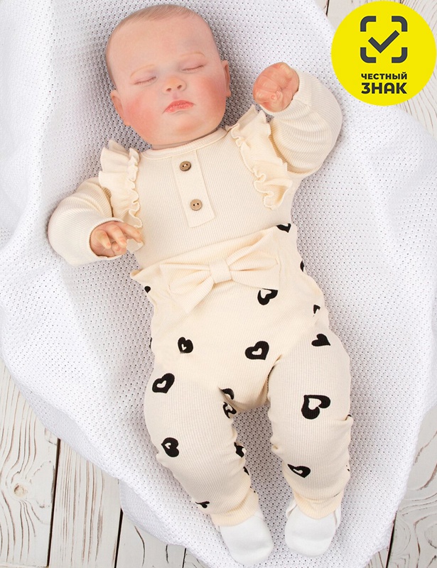 Комплект состоит из боди и ползунков. У боди на проймах рюши, округлая горловина, спереди втачная планка с пуговицами, по низу застёжка на кнопки. Ползунки с открытыми ножками и манжетами снизу, на поясе эластичная резинка, декорированы минималистичным принтом и украшены бантом.