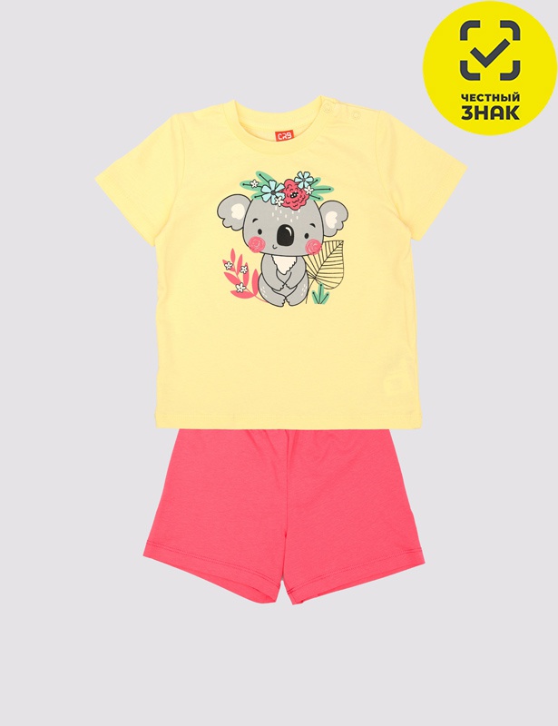 Комбинированный двухцветный комплект из футболки и шорт. Футболка прямого силуэта с коротким рукавом. Горловина круглая, обработана бейкой из полотна с эластаном. В плечевом шве предусмотрена застёжка на кнопки. Перед футболки декорирован принтом. Шорты с цельнокроеным поясом, который обработан плоским швом вподгибку с одновременным прокладыванием эластичной резинки.