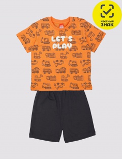 Двухцветный комплект из футболки и шорт. Футболка прямого силуэта с коротким рукавом, круглая горловина, обработанная бейкой из полотна с эластаном. В плечевом шве застёжка на кнопки. Перед футболки украшен ярким принтом. Шорты с цельнокроеным поясом, обработанным плоским швом вподгибку с прокладкой резинки.