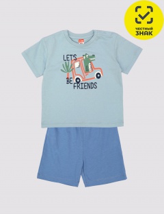 Двухцветный комплект из футболки и шорт. Футболка прямого силуэта с коротким рукавом, круглая горловина, обработанная бейкой из полотна с эластаном. В плечевом шве застёжка на кнопки. Перед футболки украшен ярким принтом. Шорты с цельнокроеным поясом, обработанным плоским швом вподгибку с прокладкой резинки.