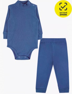 Комплект ясельный, выполнен из однотонного интерлока в широкий мягкий рубчик. Боди с длинными втачными рукавами, воротником-стойкой, застежка на кнопки по плечу и по низу. Брючки полуприлегающего силуэта по талии на резинке, по низу на манжетах.