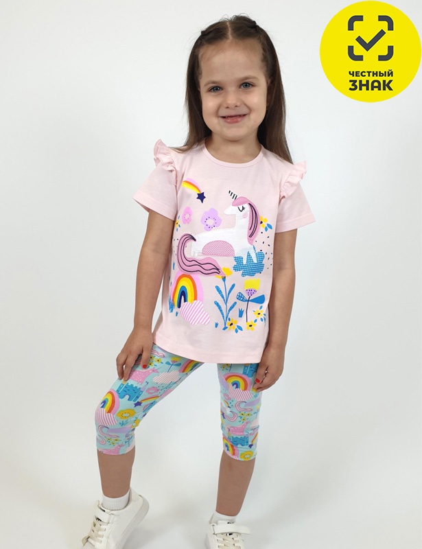 Комплект для девочки. Футболка силуэта трапеция, короткий втачной рукав, в пройме рюша. Горловина окантована, застежка на пуговицу по спинке. Вышивка и печать спереди. Лосины укороченные с печатью на правой стороне внизу, вверху на резинке.