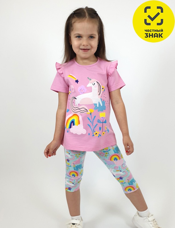 Комплект для девочки. Футболка силуэта трапеция, короткий втачной рукав, в пройме рюша. Горловина окантована, застежка на пуговицу по спинке. Вышивка и печать спереди. Лосины укороченные с печатью на правой стороне внизу, вверху на резинке.