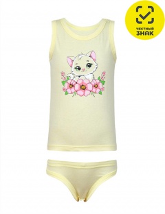 Комплект белья для девочки. Майка прямая, печать на переде, горловина и пройма окантованы. Трусы на резинке, сзади печать, ножки окантованы.