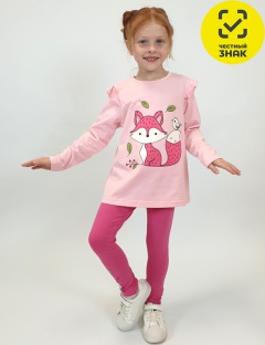 Комплект для девочки, состоящий из фуфайки и лосин. Фуфайка-силуэт трапеция, длинный втачной рукав, в пройме рюша. Горловина окантована, застежка на пуговицу по спинке. Вышивка и печать спереди. Лосины длинные, с печатью на правой стороне внизу, вверху на резинке.