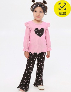 Комплект для девочки состоит из джемпера и штанов. Джемпкер прямого кроя с округлой горловиной и длинными рукавами с рюшей. На полочке аппликация. В пройме втачная рюша. Брюки длинные, расклешенные. Нижние срезы обработаны декоративным волнообразным швом.