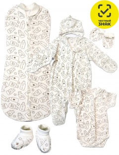 Ясельный комплект «швы наружу» из хлопкового интерлока: комбинезон, боди, шапочка, спальный мешок, антицарапки, пинетки. Комбинезон с длинными втачными рукавами с антицарапками, центральной застежкой на кнопки. Боди с короткими рукавами, на кнопках. Шапочка на завязках. Отдельно рукавички-антицарапки и пинетки. Спальный кокон на молнии.