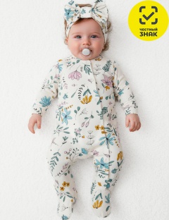 Комплект для девочки состоит из комбинезона и повязки. Комбинезон ясельный из набивного полотна, длинный рукав с манжетом, смещенная застежка на кнопках, воротник-стойка, закрытая ножка. Повязка с бантом.