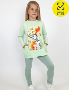 Комплект для девочки (джемпер+лосины). Джемпер свободного кроя, с печатью по переду, с двумя карманами в боковых швах. Рукав втачной, длинный. Низ изделия подшит с резинкой по боковым швам. Горловина обработана ластиком. Лосины длинные на резинке, без боковых швов.