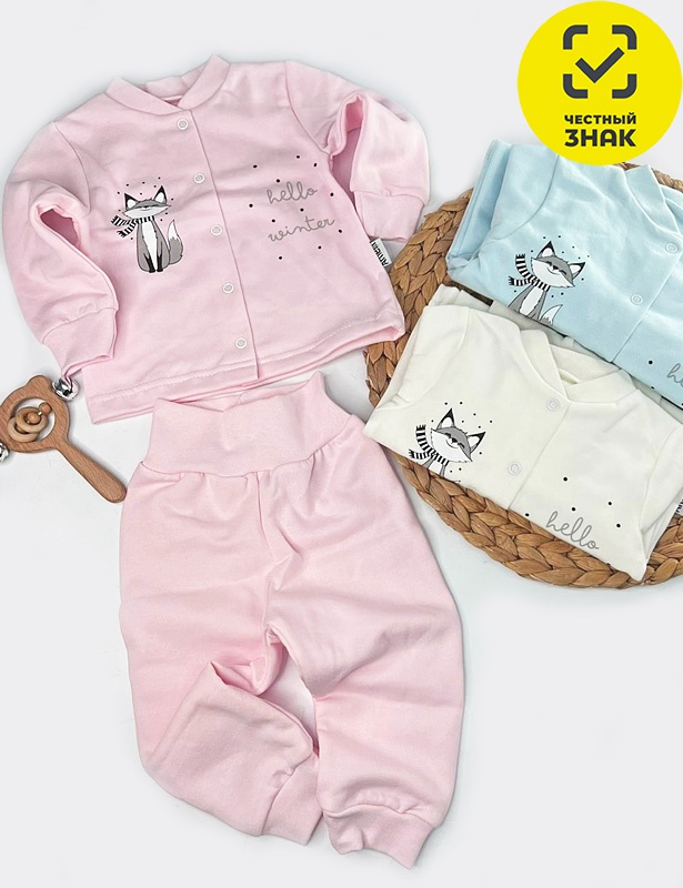 Комплект состоит из двух предметов: кофты и ползунков. Кофта с длинными рукавами, воротник-стойка, застёжка на кнопках, на полочке печать. Ползунки с закрытыми ножками, присборенные зиг-заг резинкой.