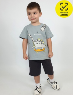 Комплект для мальчика (футболка+шорты). Футболка-прямая, перед с печатью и вышивкой. Рукав втачной, короткий. Горловина обработана ластиком. Шорты-укороченные с притачным поясом и резинкой. Два боковых кармана.