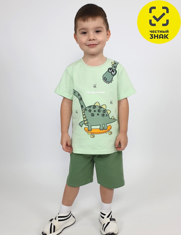 Комплект для мальчика (футболка+шорты). Футболка-прямая, перед с печатью и вышивкой. Рукав втачной, короткий. Горловина обработана ластиком. Шорты-укороченные с притачным поясом и резинкой. Два боковых кармана.