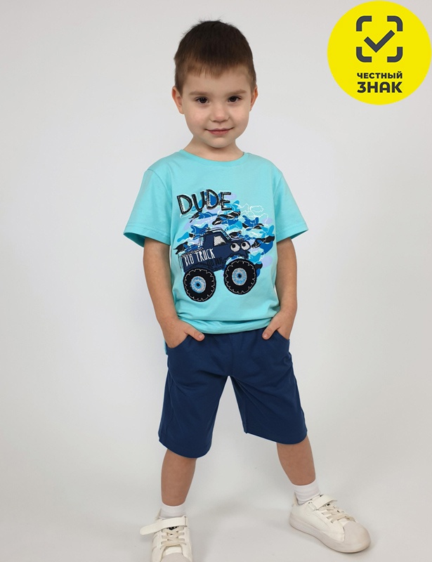 Комплект для мальчика состоит из 2-х предметов. Футболка прямая, перед с печатью и вышивкой. Рукав втачной, короткий. Горловина обработана ластиком. Шорты укороченные с притачным поясом и резинкой. Два боковых кармана.