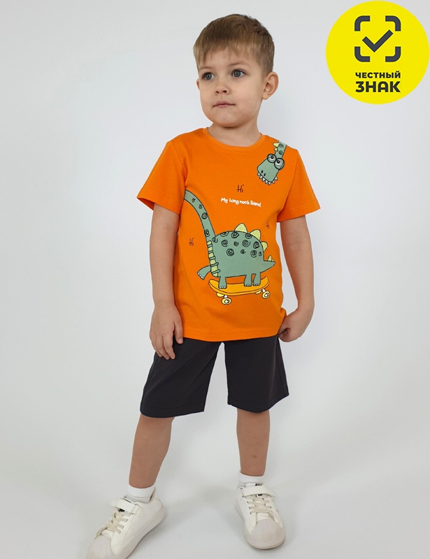 Комплект для мальчика (футболка+шорты). Футболка прямая, короткий втачной рукав, перед с печатью и отделочным карманом. Горловина обработана ластиком. Шорты укороченные с притачным поясом и резинкой. Два боковых кармана.