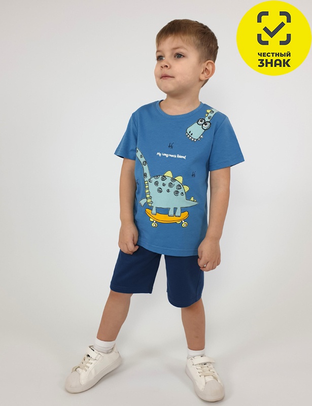 Комплект для мальчика (футболка+шорты). Футболка прямая, короткий втачной рукав, перед с печатью и отделочным карманом. Горловина обработана ластиком. Шорты укороченные с притачным поясом и резинкой. Два боковых кармана.