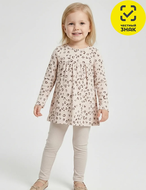Комплект для девочки состоит из 2-х предметов. Туника из набивного полотна, с длинными втачными рукавами, округлый вырез горловины. Лосины облегающие на поясе на резинке.