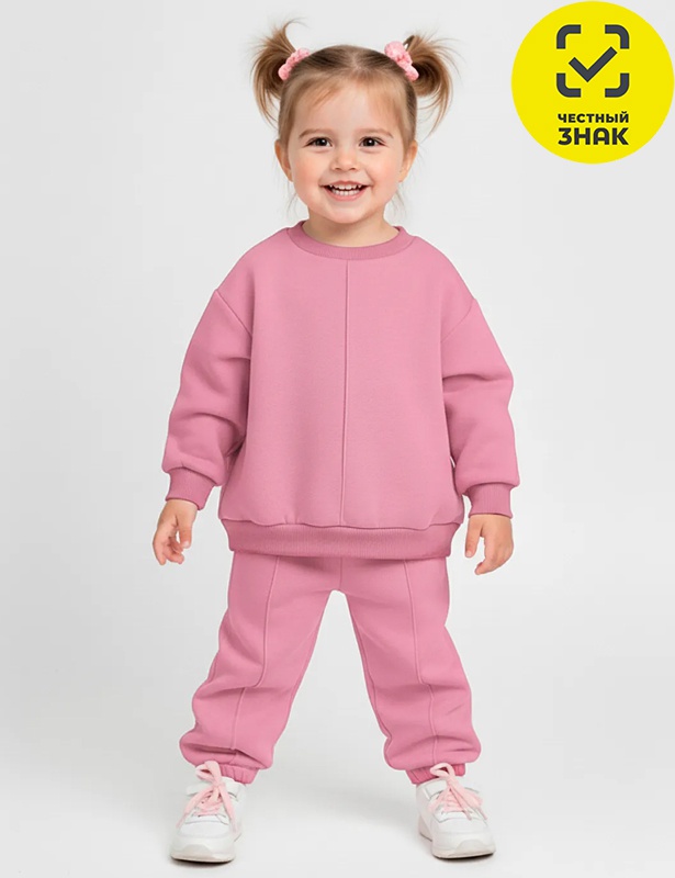 Костюм детский из футера с начесом, состоит из 2-х предметов. Толстовка с длинными втачными рукавами на манжетах, со спущенной линией плеча. Брюки на поясе на резинке.