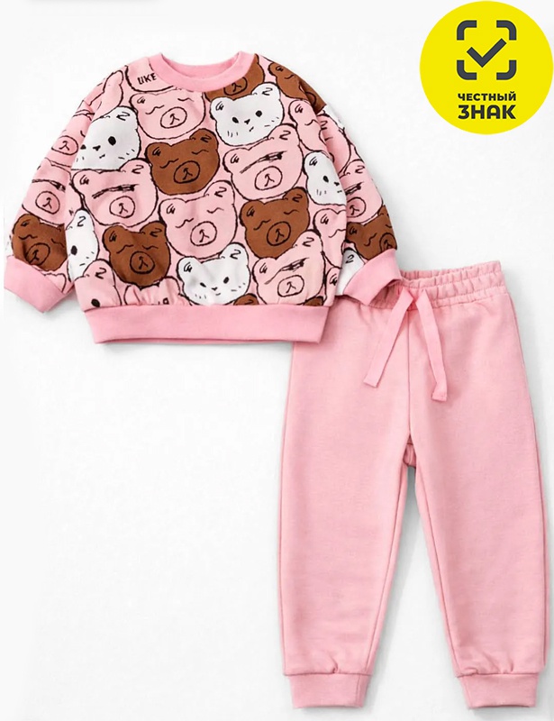 Костюм состоит из 2-х предметов. Джемпер из набивного футера двухнитки с начесом, с длинными рукавами покроя реглан на манжетах, на кнопке по вороту, притачной пояс по низу изделия. Брюки на поясе на резинке, по нижним срезам на манжетах, карманы по бокам.