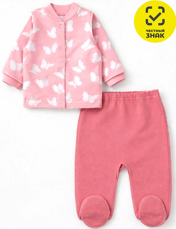Комплект ясельный из мягкого футера с начесом, швы наружу. Кофточка на кнопочках и с открытыми ручками. Пояс ползунков на резинке, ножки закрытые.