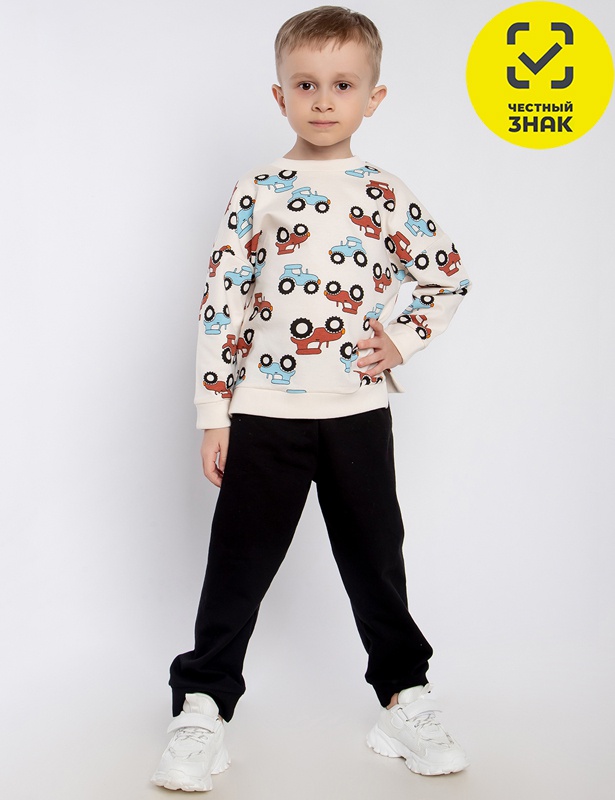 Костюм для мальчика состоит из 2-х предметов. Джемпер из набивного футера, с длинный рукавом со спущенной линией плеча, рукава на манжетах, притачной пояс снизу, разрезы по бокам. Брюки однотонные, на поясе на резинке, манжеты снизу.