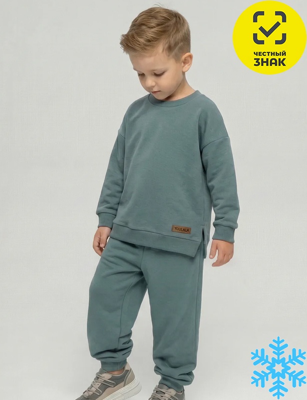 Костюм детский из футера трехнитки с начесом, состоит из 2-х предметов. Толстовка с длинными втачными рукавами на манжетах, со спущенной линией плеча.Брюки на поясе на резинке, снизу на притачных манжетах.