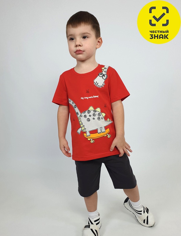 Комплект для мальчика. Фуфайка-прямая, перед с печатью и вышивкой. Рукав втачной, короткий. Горловина обработана ластиком. Шорты-укороченные с притачным поясом и резинкой. Два боковых кармана.