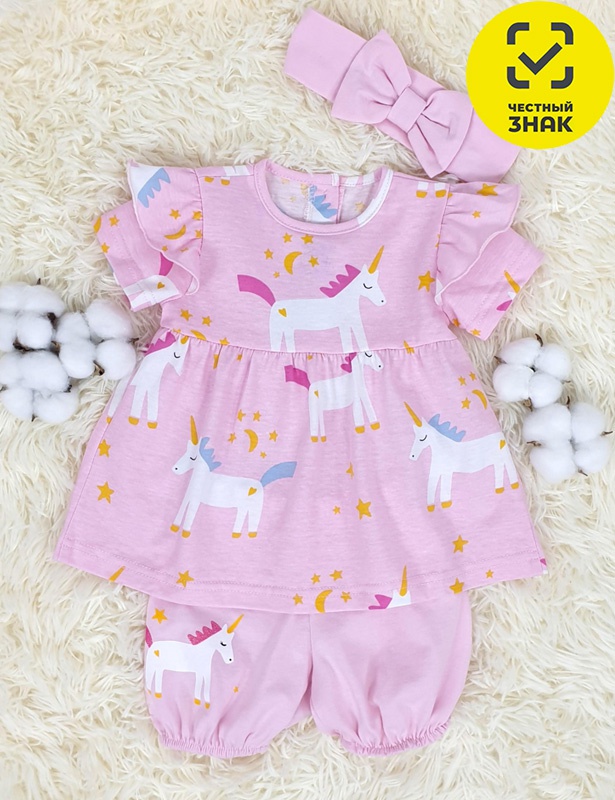 Комплект для девочки включает платье и трусы. Платье имеет силуэт «трапеция» и отрезную кокетку. Юбка собрана по низу. На переде кокетки и юбки есть печать и вышивка. Рукав короткий, с рюшами по окату. Застёжка на пуговицы расположена по спинке. Трусы вверху на резинке, по ножкам собраны на резинку и подшиты. Отделочный элемент — повязка с бантом на резинке.