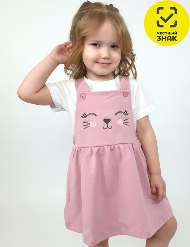 Комплект для девочки (сарафан+футболка). Сарафан с отрезной кокеткой с вышивкой по переду. Кокетка переда и спинки на подкладке. Застежка по боковым швам на пуговицы. Юбка со сборкой. Лямки пристегиваются на пуговицы к кокетке, отделочный элемент "ушки" на переде. Футболка - прямая, короткий рукав. Горловина обработана ластиком.