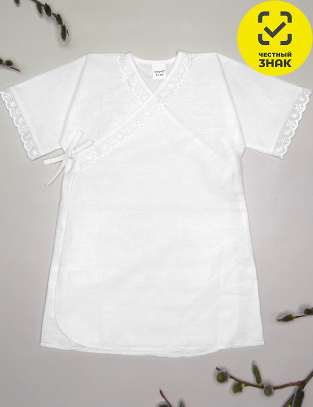 Крестильная рубашечка на «запах», выполнена из гладкой однотонной бязи, декорирована кружевом по горловине и рукавам.