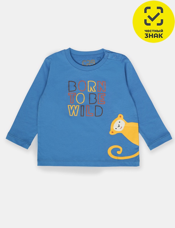 Джемпер для мальчика из мягкого трикотажа. Слегка спущенное плечо и свободный силуэт. Горловина круглая, оформлена кашкорсе. На плече застежка на кнопки. На полочке выполнена шелкография - обезьянка. Надпись гласит - рожденный быть свободным.
